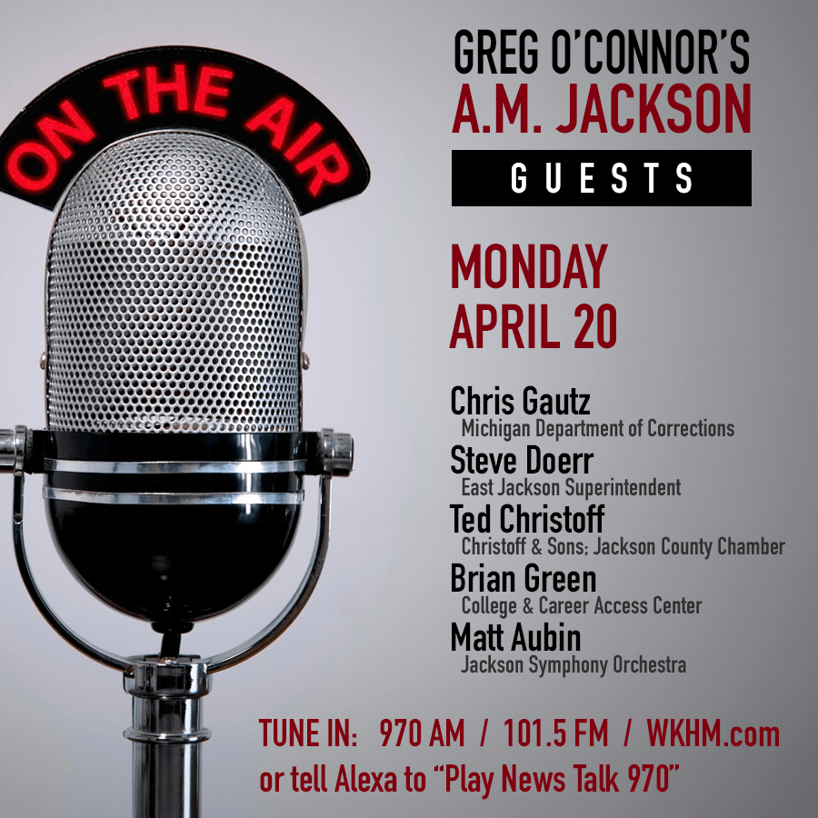 Tune in to 970AM, 101.5FM or online at WKHM.com Monday, April 20th from 6am-10am to hear from Greg O’Connor’s guests:
