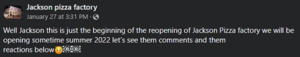 JACKSON, MI – Pizza lovers will get another option in Jackson for a slice. The Jaxon Pizza Factory has been purchased by longtime Jackson resident Brent Harmon who changed the name slightly to The ‘Jackson Pizza Factory’. Harmon is currently renovating the floors, and repainting the walls. Up next will be to get a new ceiling. In a Facebook post, the beloved pizza shop announced the return